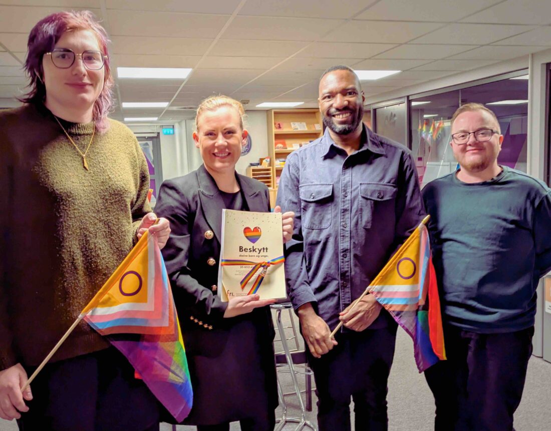 I bildet fra venstre: Rebecca Zahl, leder i Skeiv Ungdom, Lene Vågslid, Norges barne- og familieminister, Stephen Adom, leder av FRI, og James Dickson, leder PKI. Foto: PRJ/FRI.