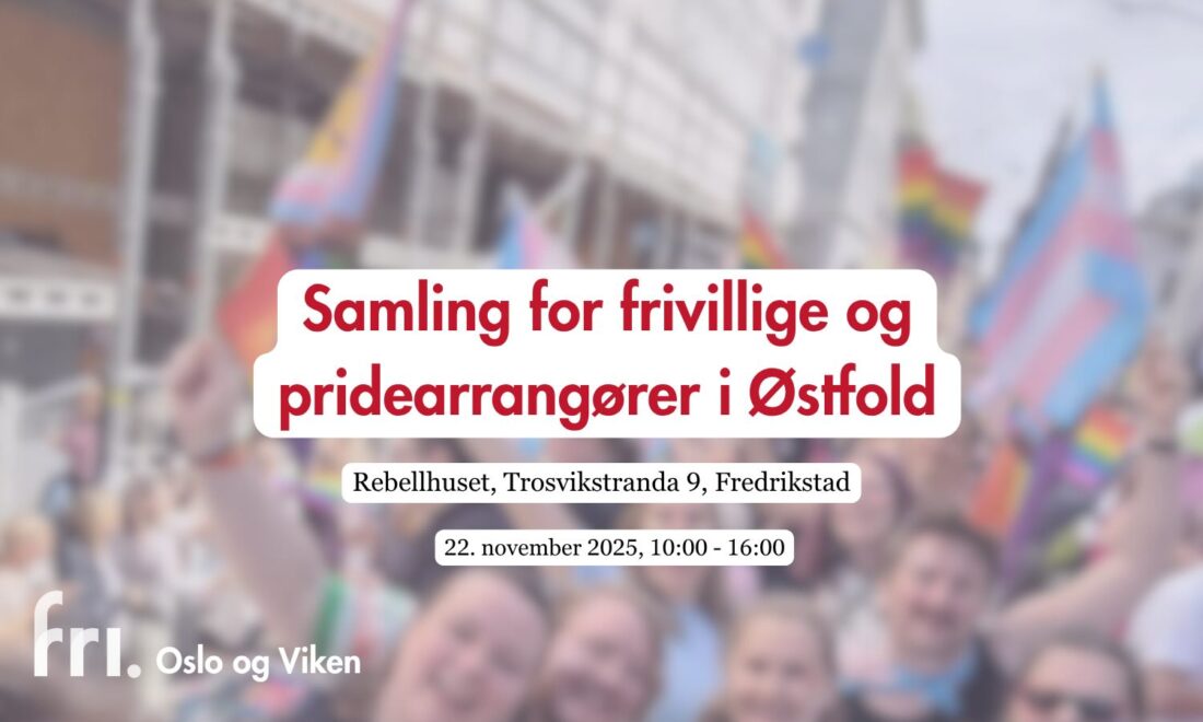 FRI Oslo og Viken samler frivillige og pridearrangører fra hele Østfold til en egen fag- og nettverkssamling i Fredrikstad lørdag 22. november 2025. Samlingen finner sted på Rebellhuset ved Trosvikstranda, og markerer starten på en tydeligere regional satsing i tråd med FRIs arbeidsprogram for 2025.